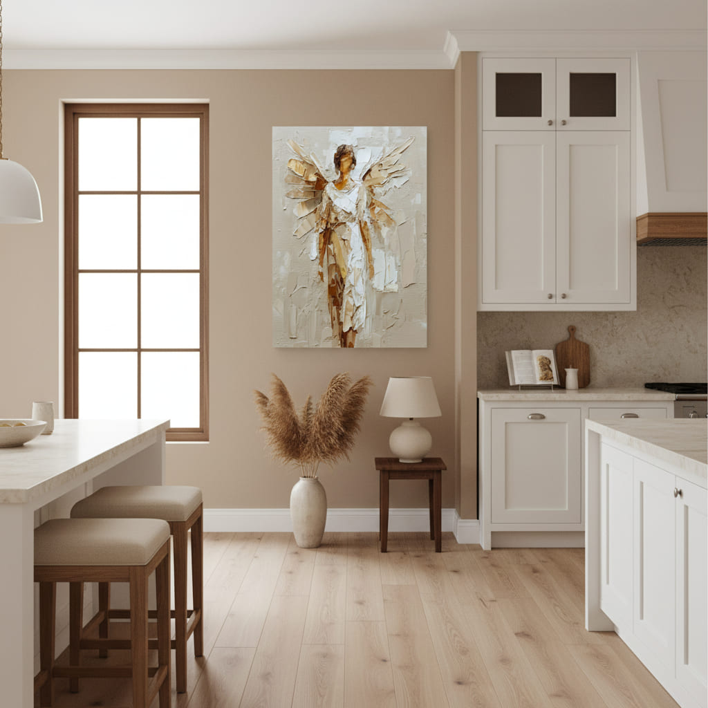 Dnevna soba: Velika slika sa anđelom može biti dominantan element iznad sofe ili kamina. Zlatni detalji i nežne boje će privući pažnju i dodati luksuz prostoru.